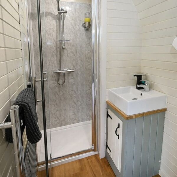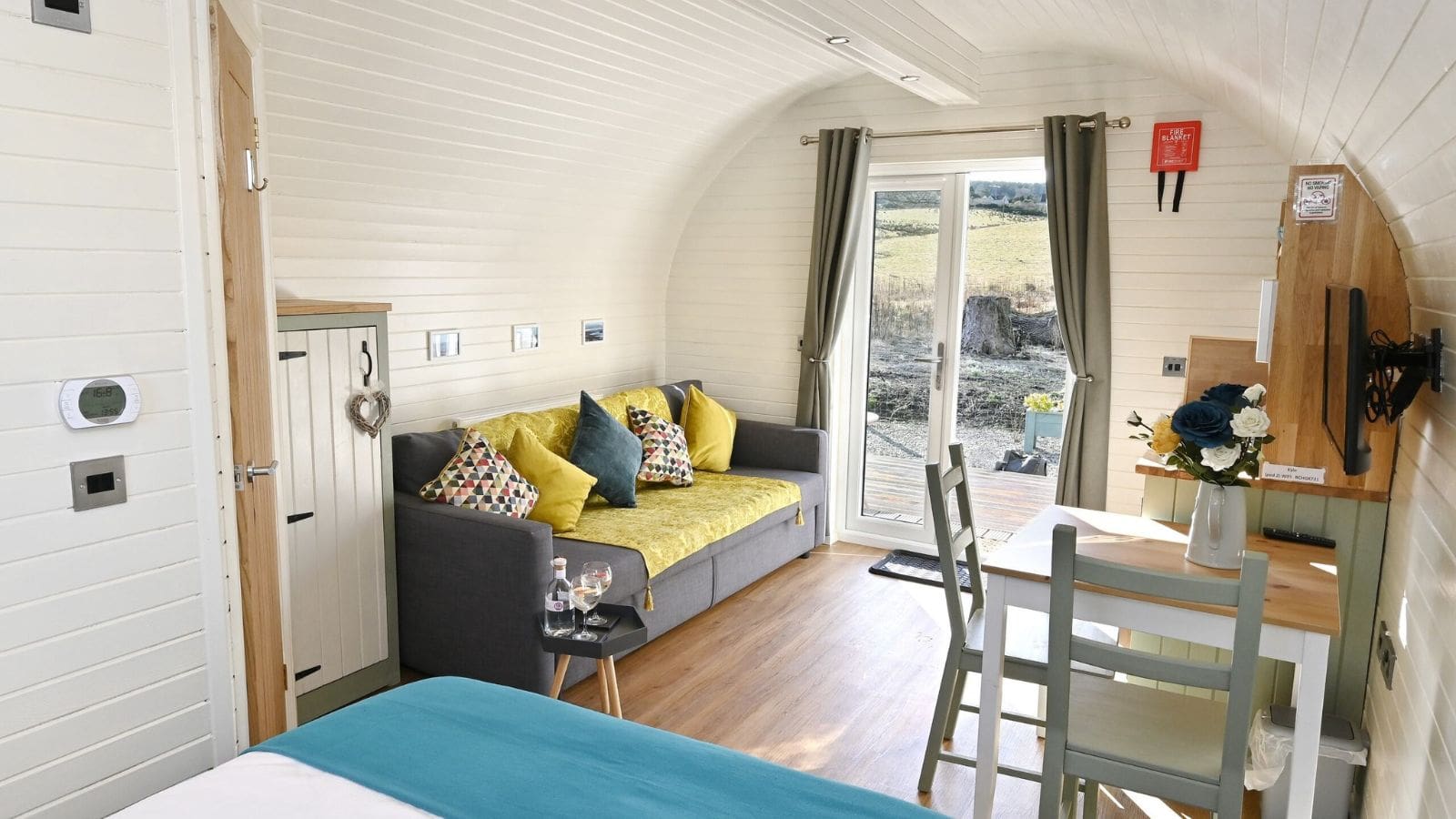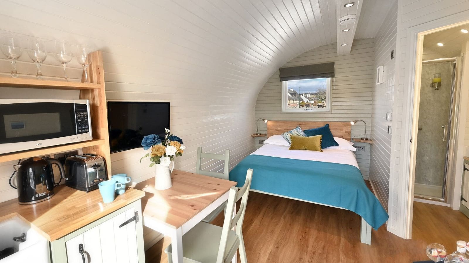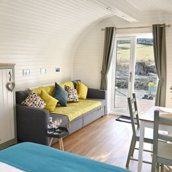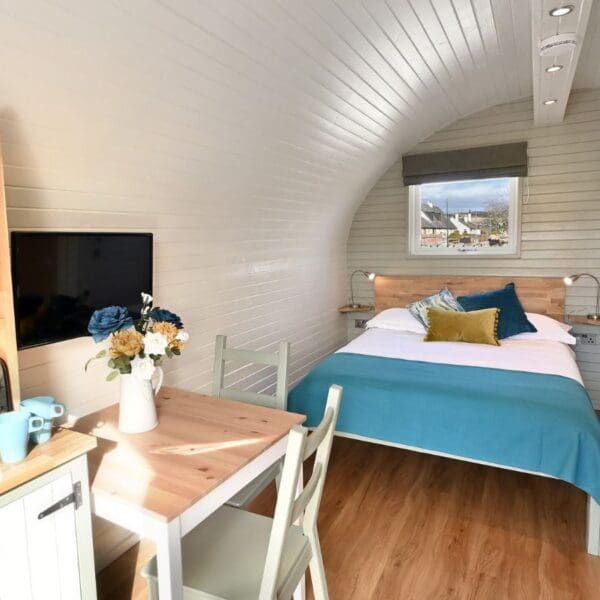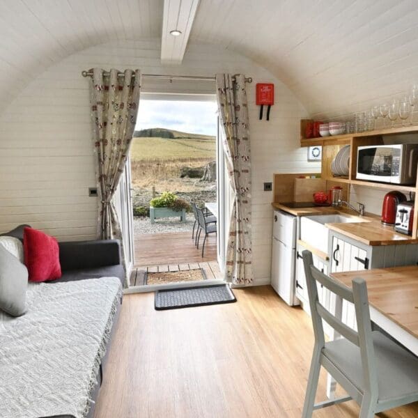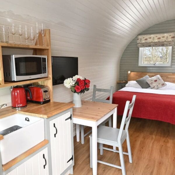 The pods are well insulated, the patio doors and the rear opening window have double glazing and there is thermostatically controlled heating in the kitchen/living area for year-round comfort.