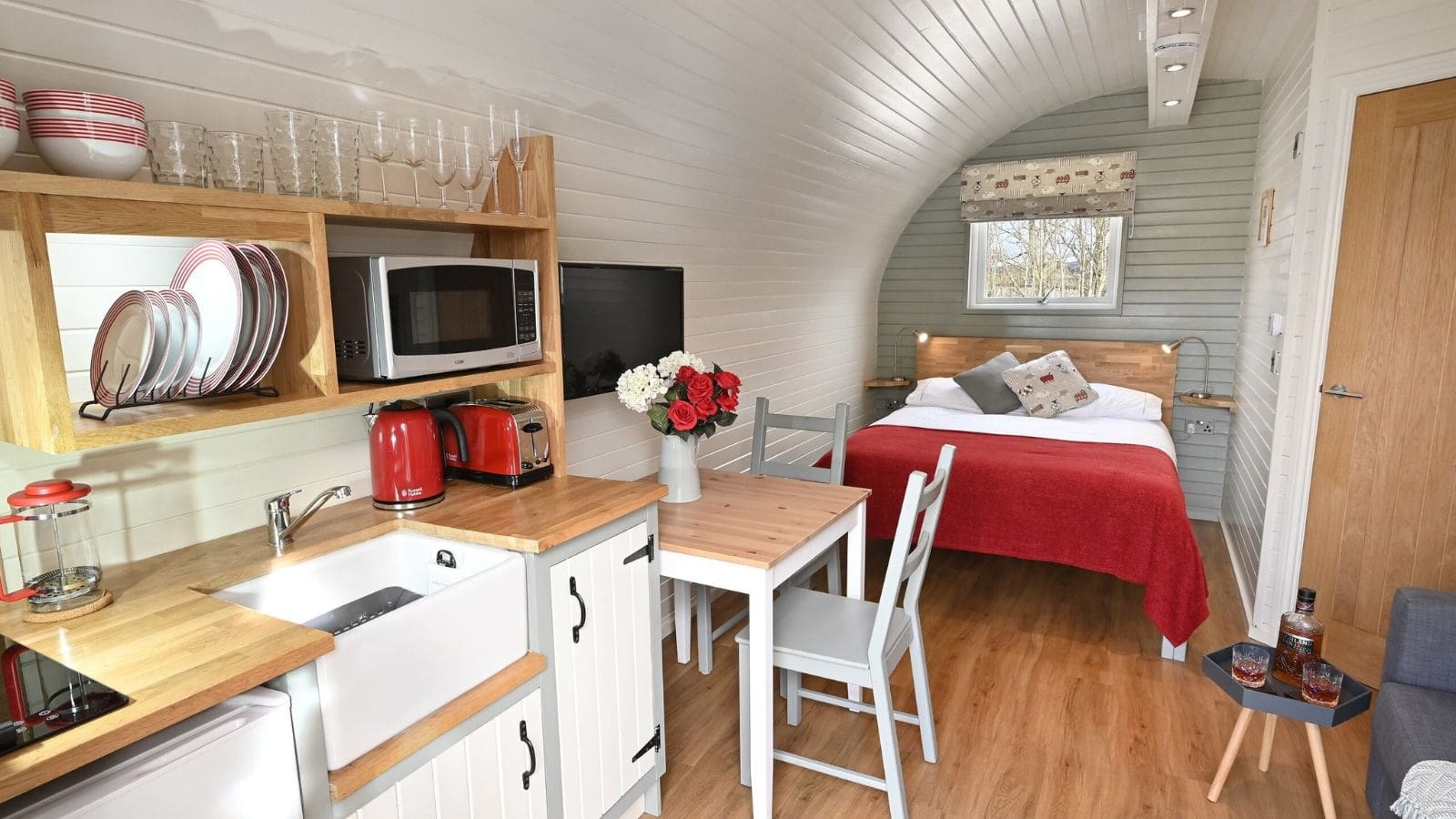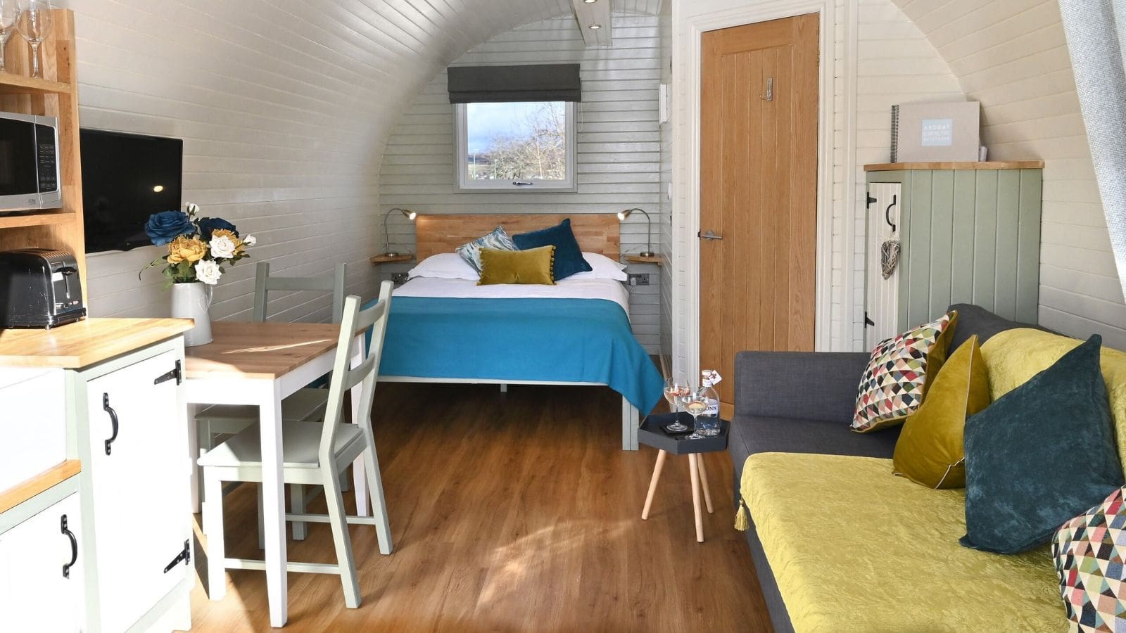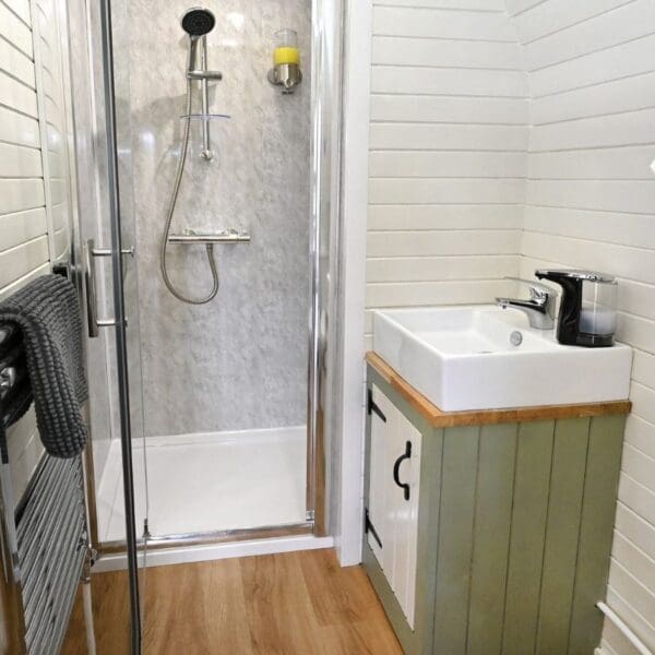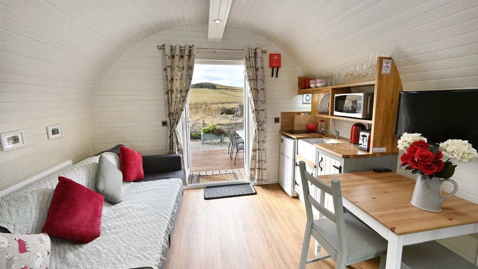 The pods are well insulated, the patio doors and the rear opening window have double glazing and there is thermostatically controlled heating in the kitchen/living area for year-round comfort.