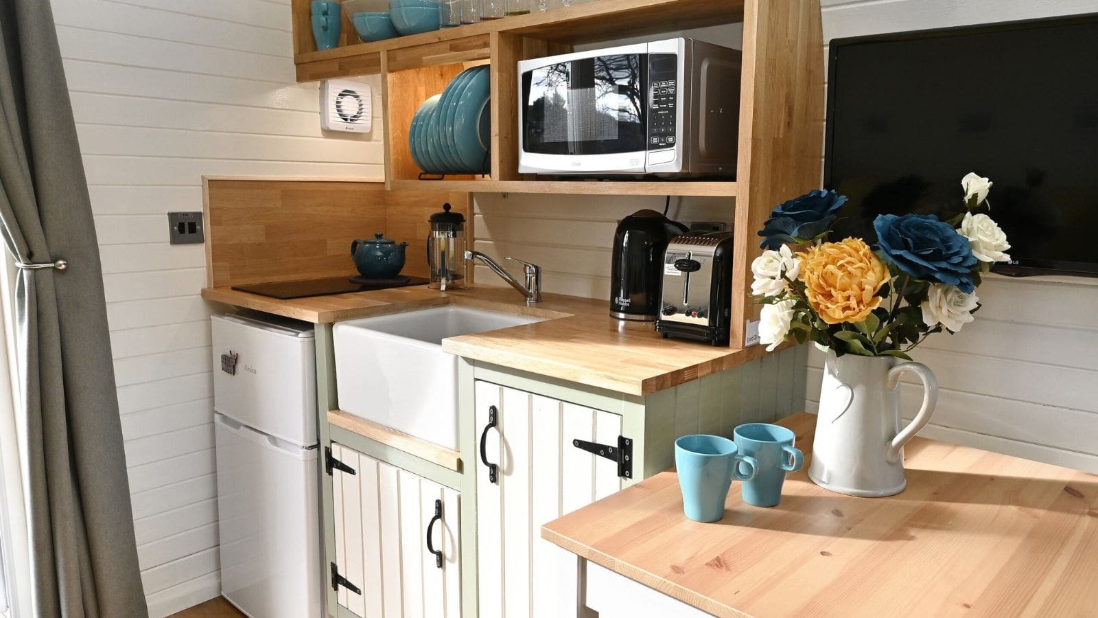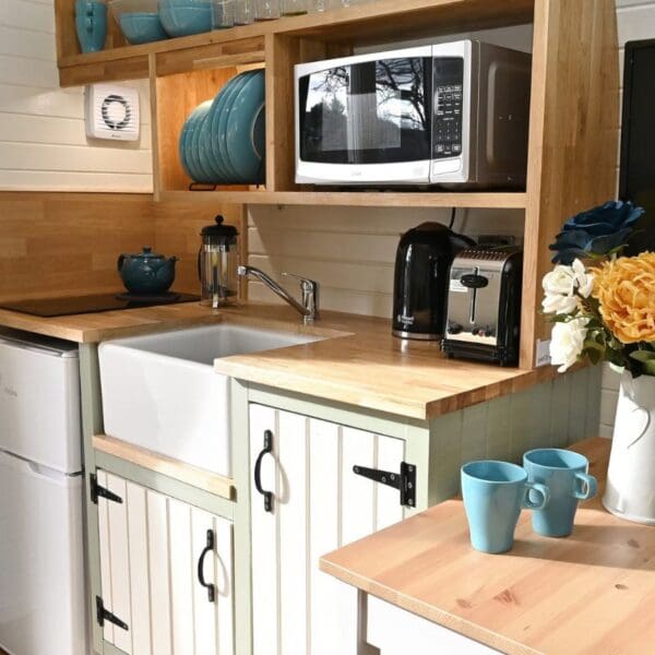 - Kitchenette with solid oak work surface and storage cupboards