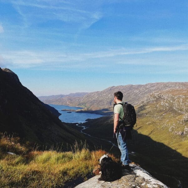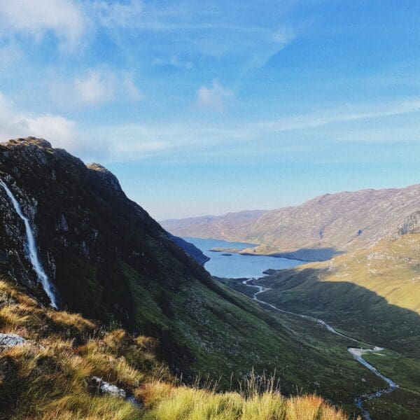 The route leads to Eas á Chual Aluin, otherwise known as Britain’s highest waterfall, where you can see right down through the brooding glen onto the vast beauty of Loch Glencoul.